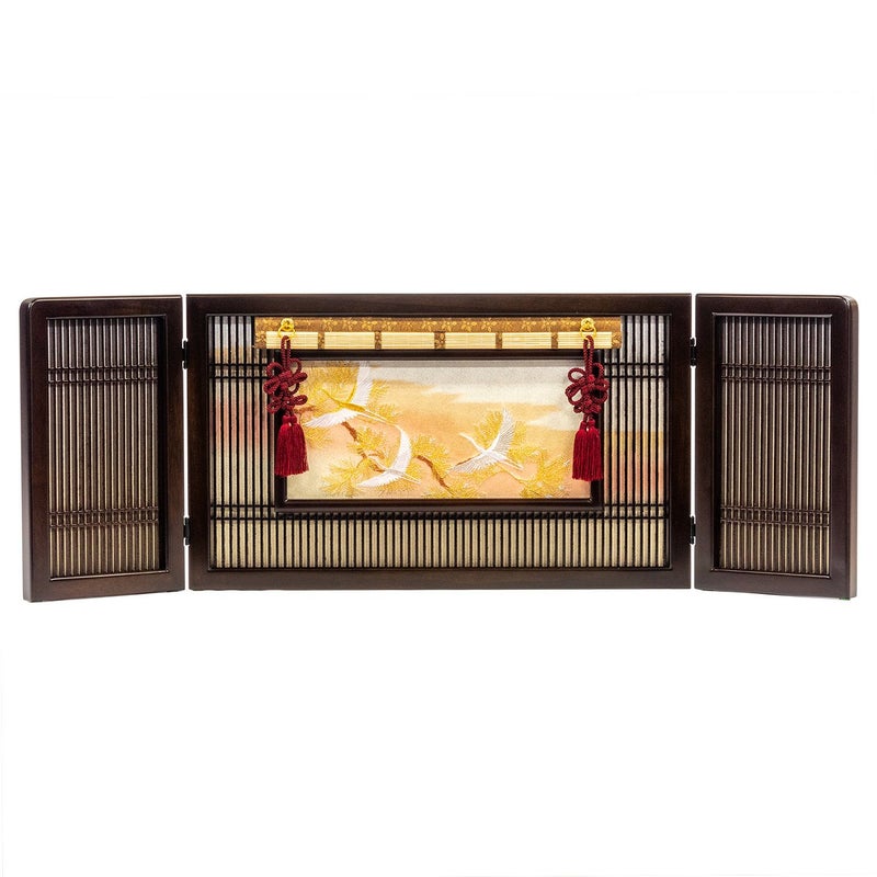 ■収納箱前面と屏風には、春窓雛のテーマモチーフの「鶴」を金銀糸で刺繍。