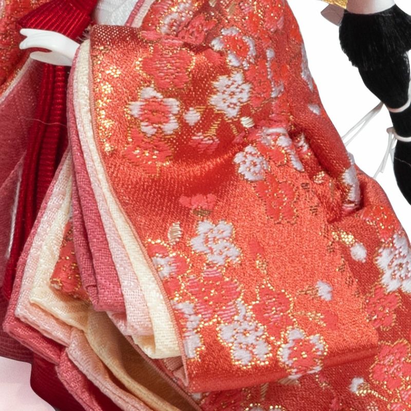 ■男雛、女雛の衣裳は格調高い色合いの菊花流し文様金襴を着せ付け。