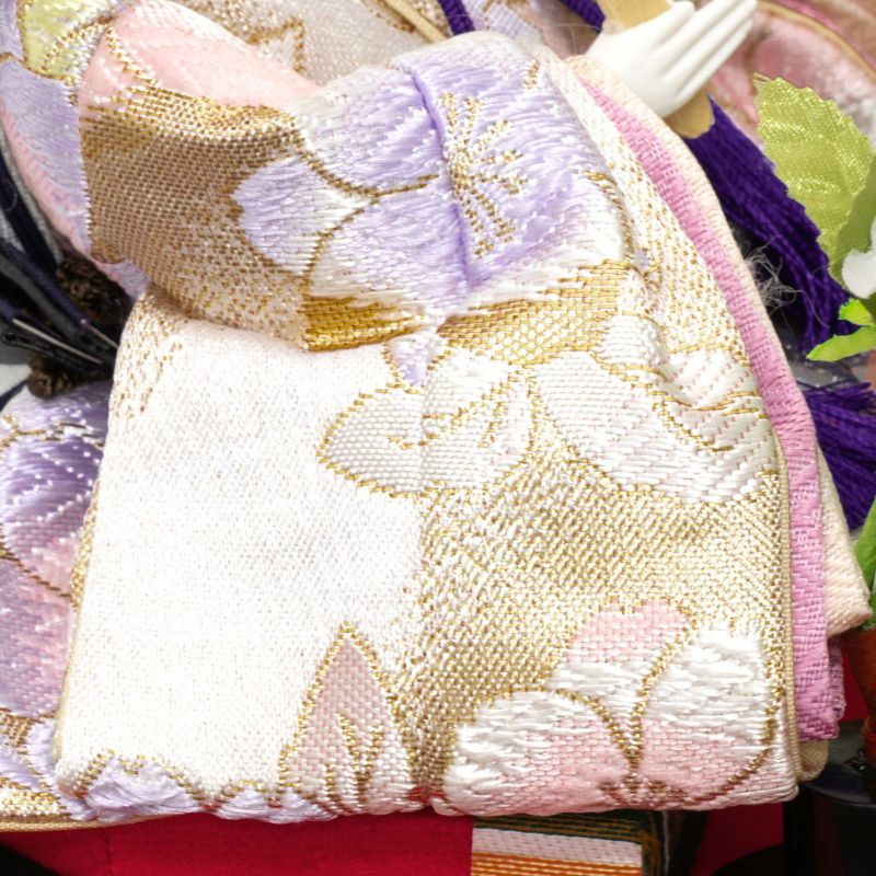 ■お人形には桜柄を織り出した衣裳を着せ付け。