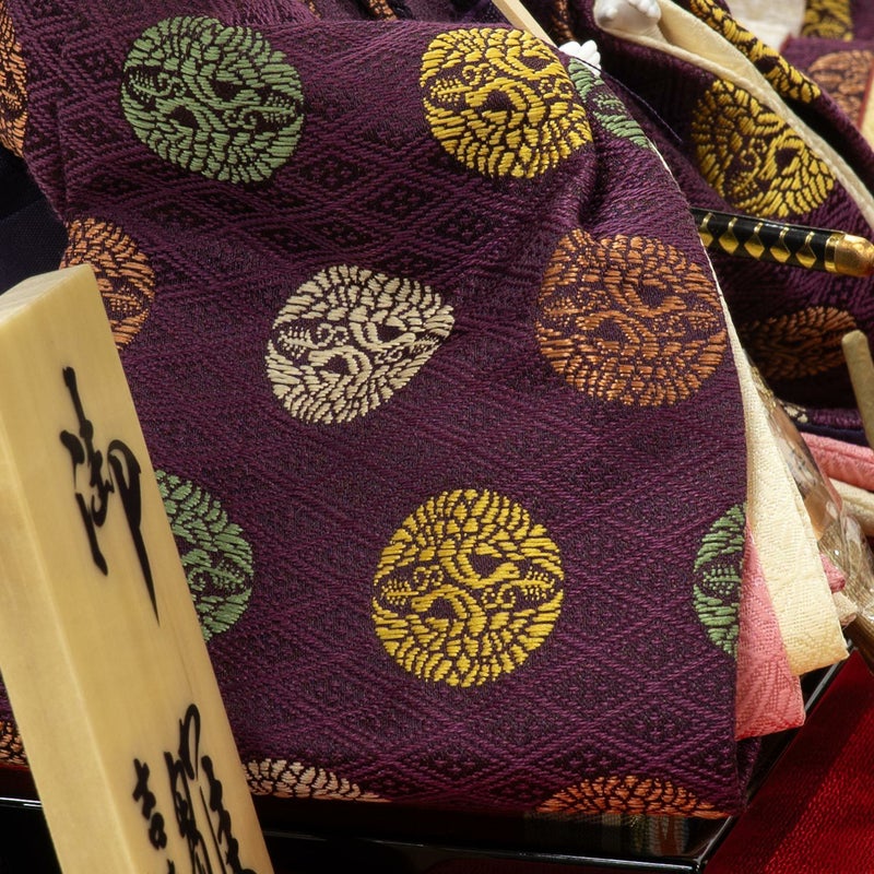 ■お人形には、有職文様の一つ「向鶴」を織り出した衣裳を着せ付け。