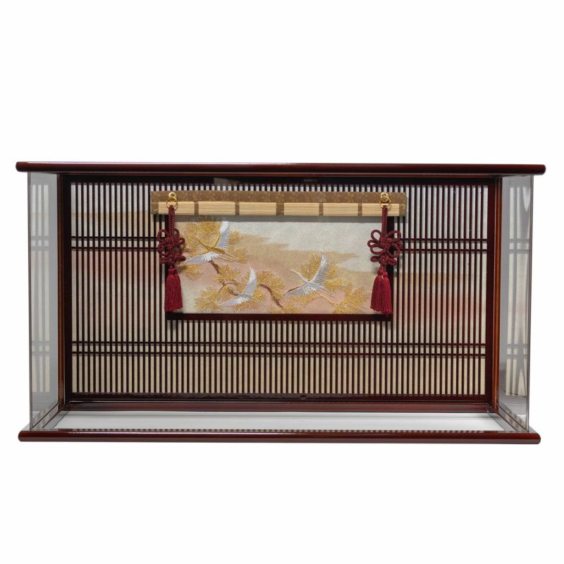 背景の格子窓の外には、昔から「長寿の象徴」・「吉祥の鳥」として人々から尊ばれてきた鶴を刺繍しました。