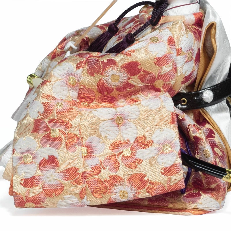 ■男雛・女雛の衣裳には、ハナミズキを織り出したあざやかな色合いの金襴を使用し着せ付け。