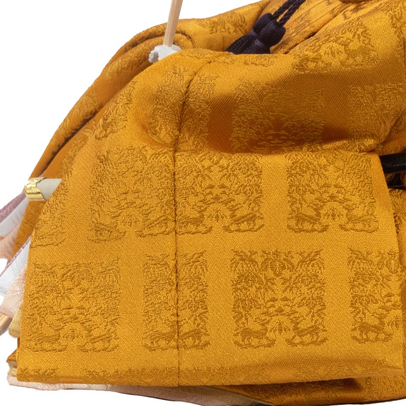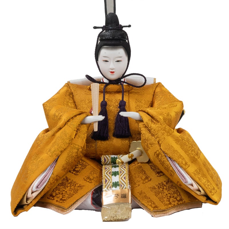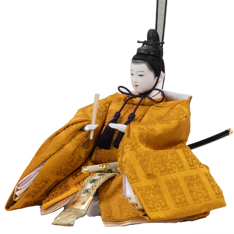 ■男雛の衣裳は天皇陛下のみが着用される桐や竹、鳳凰や麒麟の文様が織り込まれた黄櫨染御袍(こうろぜんのごほう)を着せ付けました。