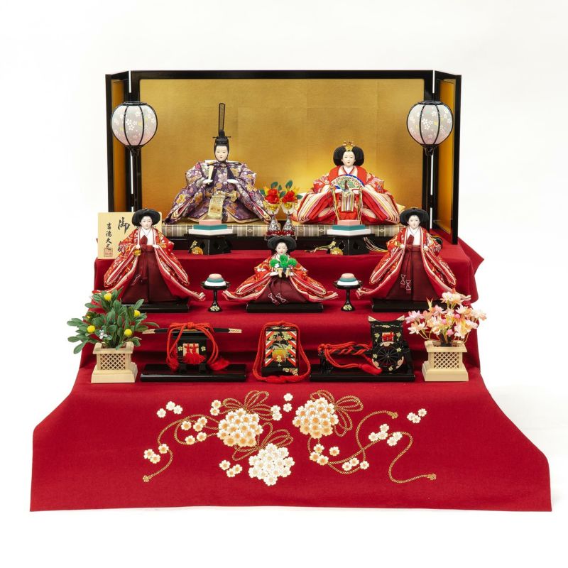 金屏風に映える桜柄衣裳を纏った毛氈タイプの五人飾りです。
