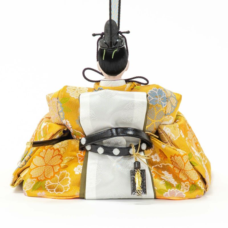 ■男雛、女雛の衣裳には、伝統文様の雪輪に桜、そして可愛らしいウサギを織り込んだ衣裳を着せ付け。