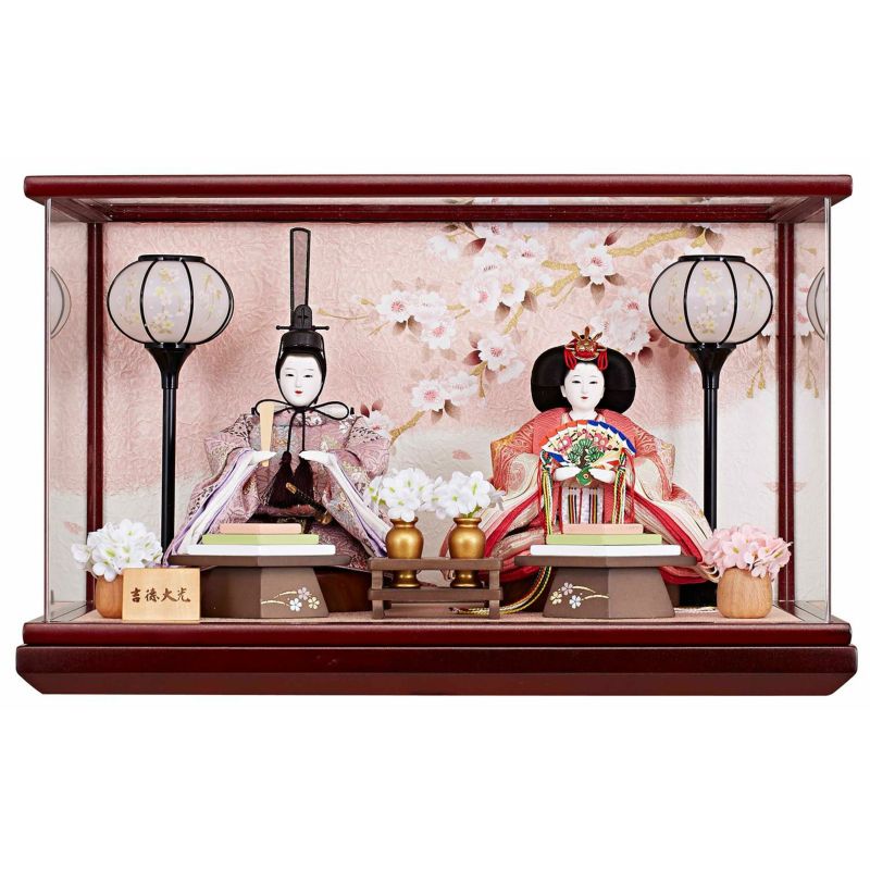 満開の枝垂れ桜を背景に優しいお顔のお雛様が仲睦まじく佇んでいるようなケース飾り。