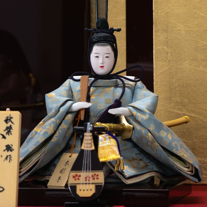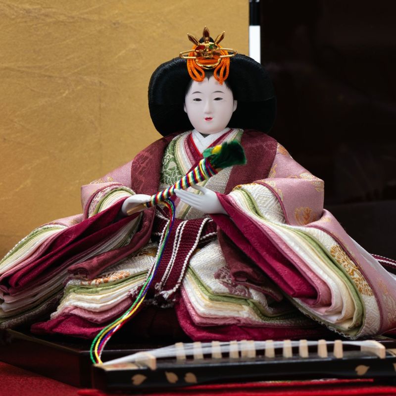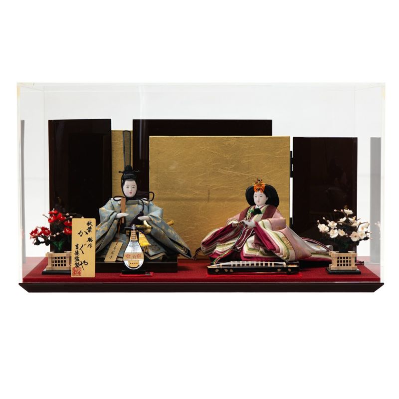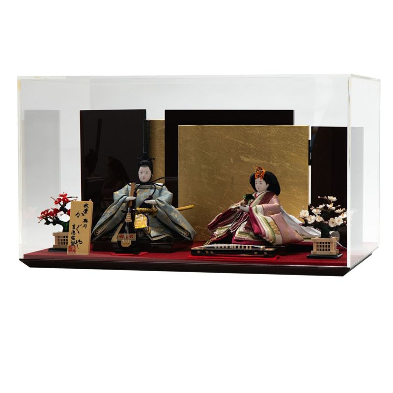 雅な風情を感じられるケース飾りです。柱がないシャープな印象のアクリルケースの中に、正絹衣裳を着せ付けた高級感あるお人形をセットしました。女雛の衣裳は裾を長くし、雅な印象に仕上げました。両脇に添えられた梅の香りとともに、琵琶・琴の音色を楽しむ…雅な風情を感じられるケース飾りです。ケース商品は梱包されていた箱から出してすぐにお飾りいただけます。