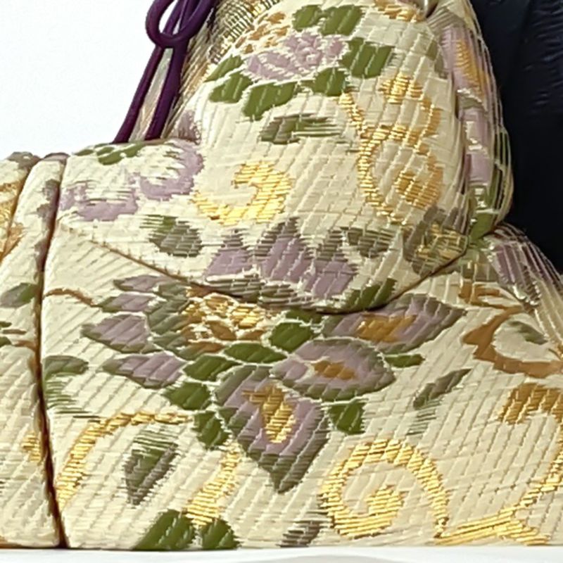 一秀作 木目込人形ピンク色の和紙で出来た屏風に淡い緑色の衣裳が映える落ち着いた雰囲気が印象的な木目込み親王飾りです。男雛女雛とも落ち着いた雰囲気ですが、それぞれに大きな花柄を衣裳に施したことで、華やかさも同時に感じます。