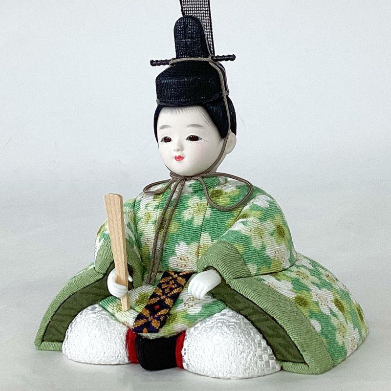 “若菜”と名付け可愛らしい花柄を男雛は緑色で、女雛は赤色の生地に織り込んだ衣裳が印象的なコンパクト雛人形です。目がパッチリと開いた丸顔の愛らしいお人形をセットしました。
