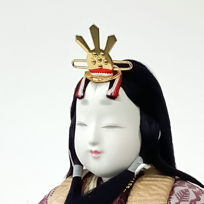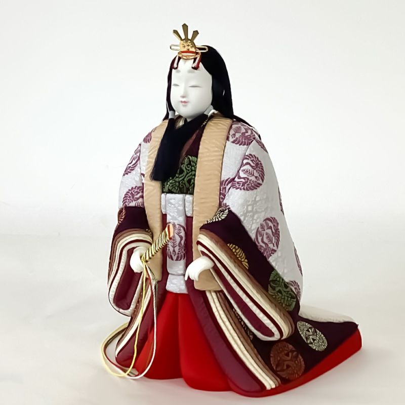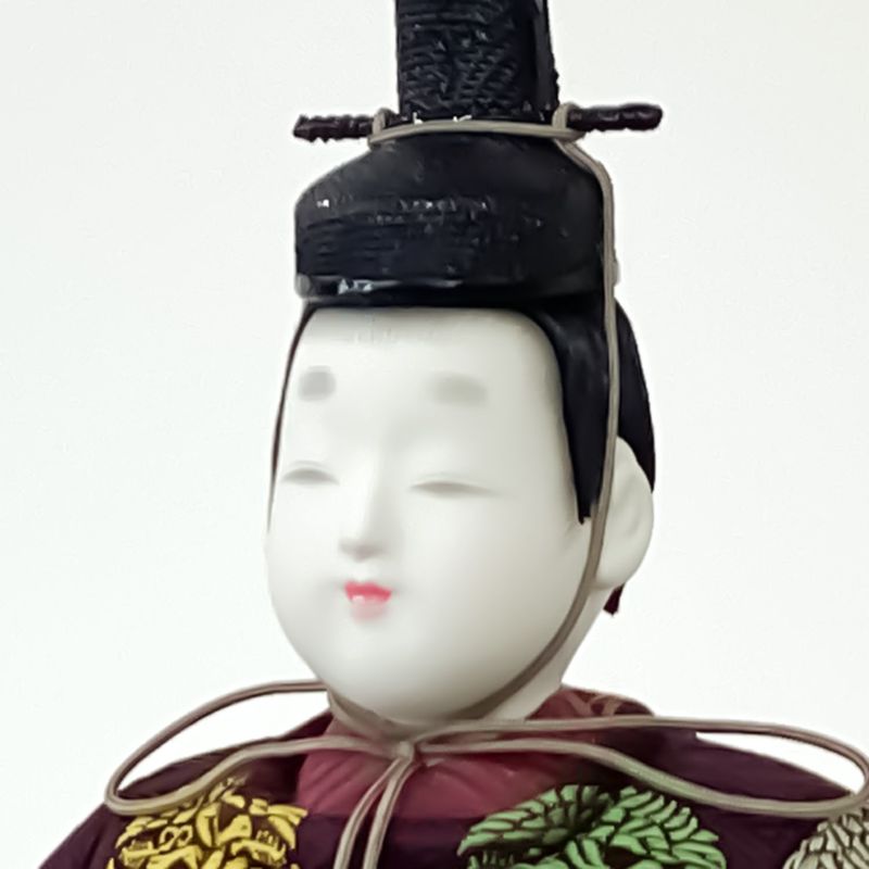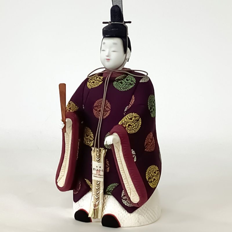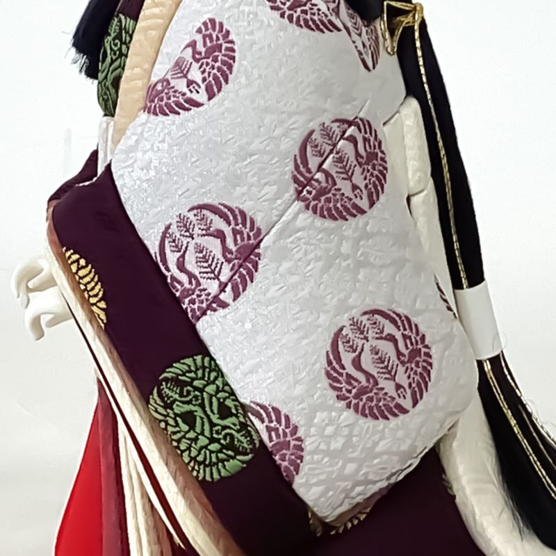描き目のお顔が愛らしい木目込み立ち姿親王飾りです。お人形を立ち姿にすることで、衣裳全体を見ることが出来るので、衣裳の華やかさが印象的な雛人形になりました衣裳には有職文様の一つである”向い鶴”文様を織り込みました。“鶴は千年”と言われるように生命力と長寿の象徴とされる吉祥紋です。また、つがいと一生添い遂げることから、“夫婦円満”の象徴でもあります。