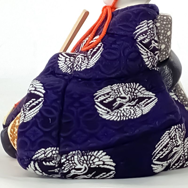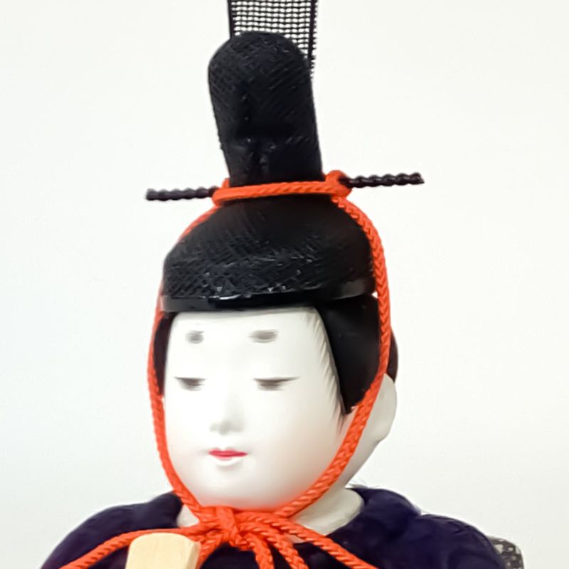 桧飾り台に小桜が描かれた屏風と和をイメージした木目込み親王飾りです。衣裳には有職文様の一つである”向い鶴”文様を織り込みました。“鶴は千年”と言われるように生命力と長寿の象徴とされる吉祥紋です。また、つがいと一生添い遂げることから、“夫婦円満”の象徴でもあります。
