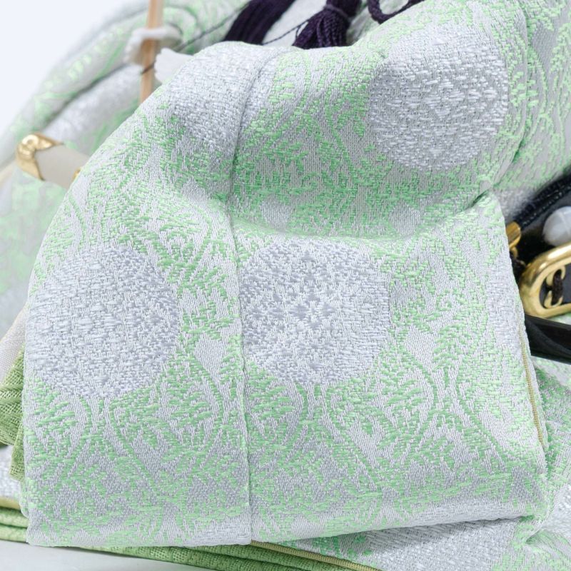 お道具の三宝には花結びという飾りをセットしました。花結びの語源は、お祝いに「華を贈る」という意味から来ているとも言い伝えられています。