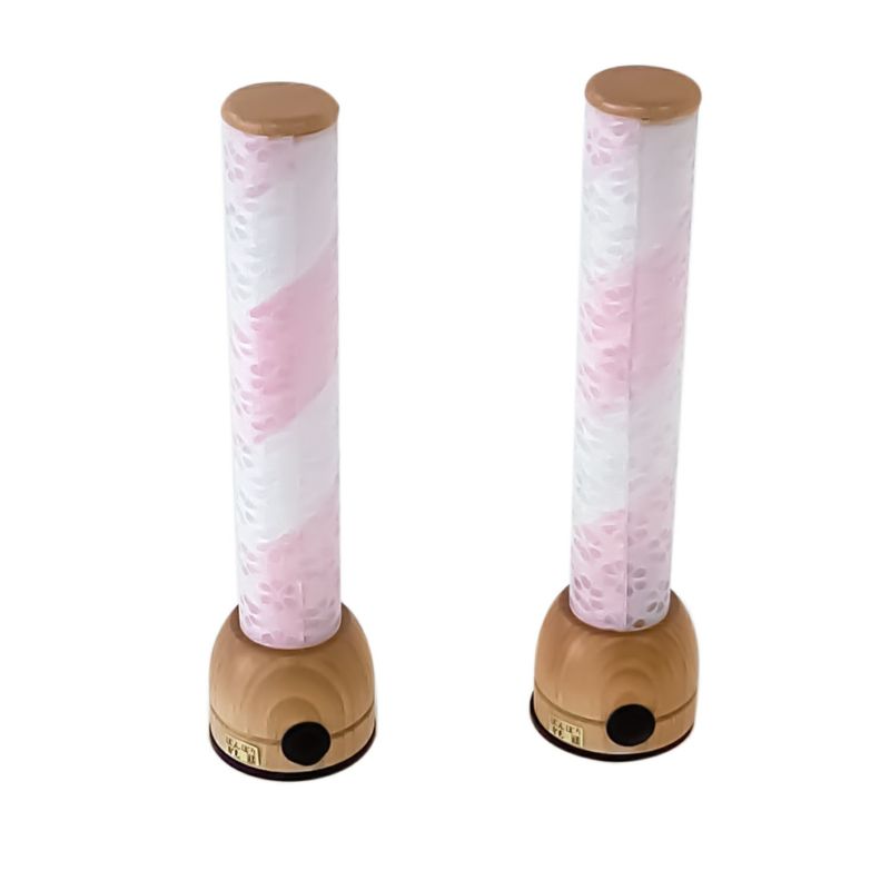 桜並木の風を彷彿させる柄を収納箱と屏風に施しました。行燈も全体の雰囲気に調和しており、コードレスタイプになっていていますので、スイッチを押して頂くと点灯します。