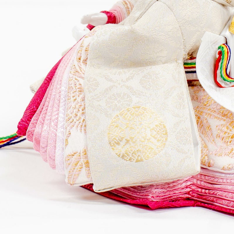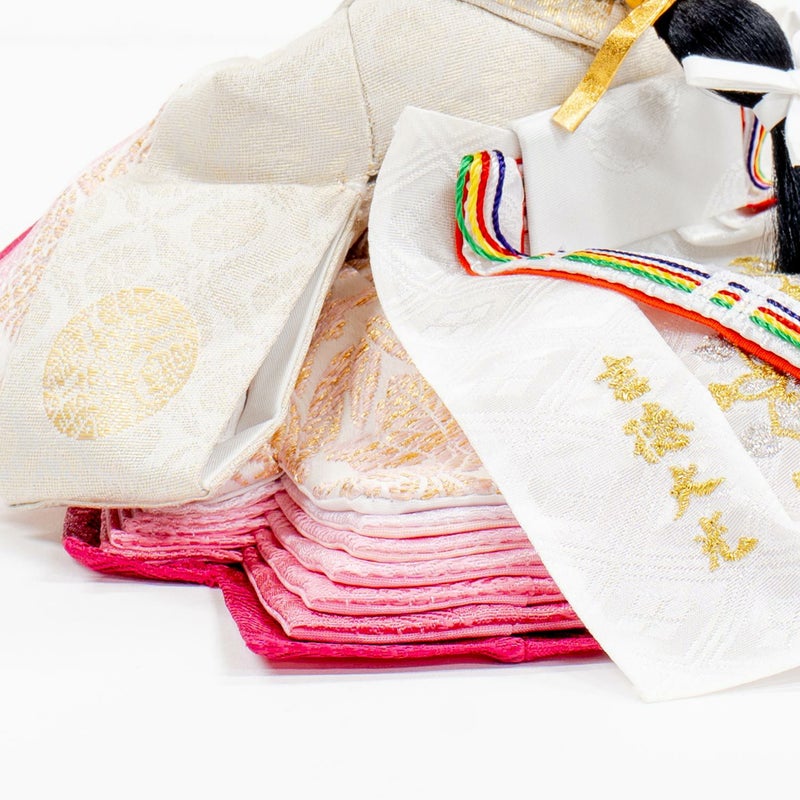 「江都みやびシリーズ」の男雛・女雛の衣裳は、正絹生地を用い、十二単を模した6枚剥ぎ。本物の衣裳のように丁寧に仕立ててから着せ付ける大変手間の掛かる本着せ付。