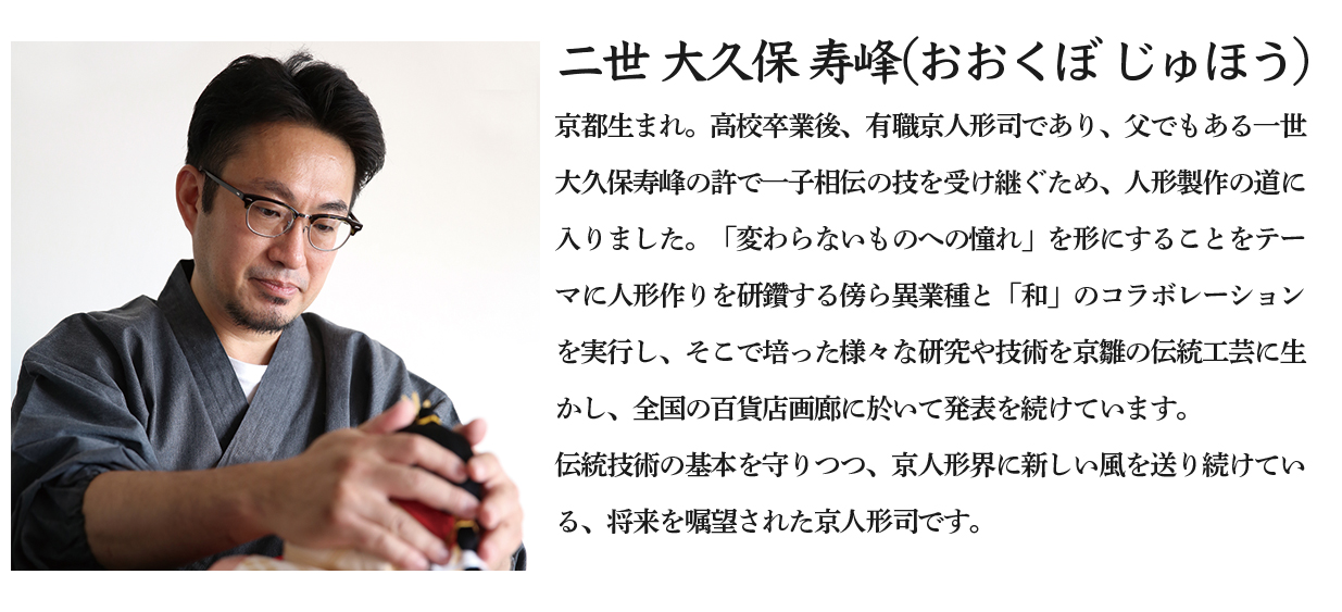 天皇、皇后両陛下が「即位礼正殿の儀」にて着用された御裳束を参考にした大久保寿峰作の親王飾りです。