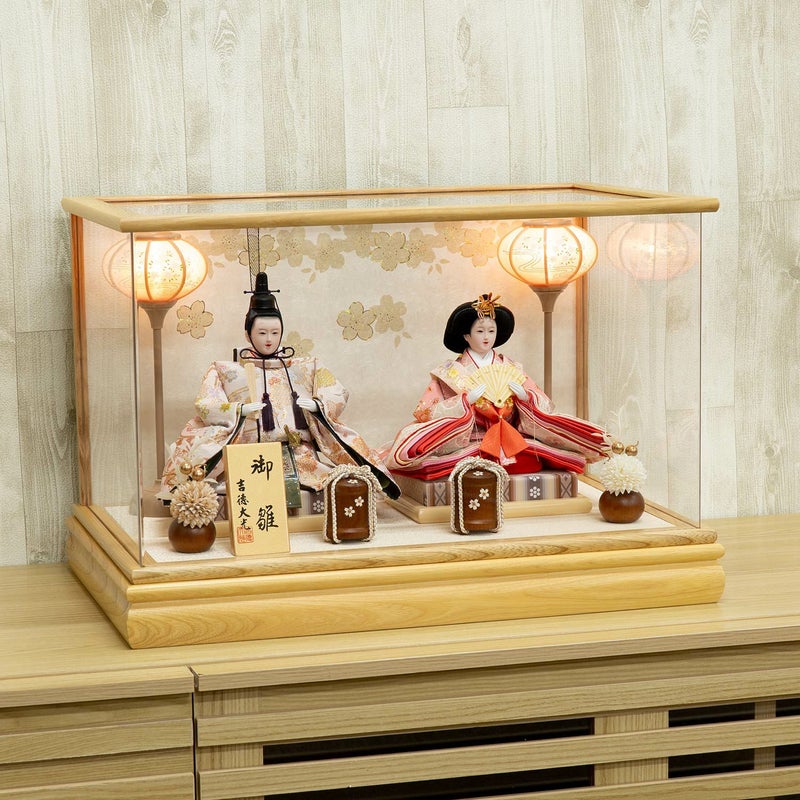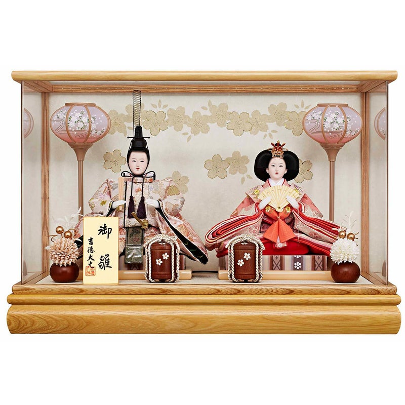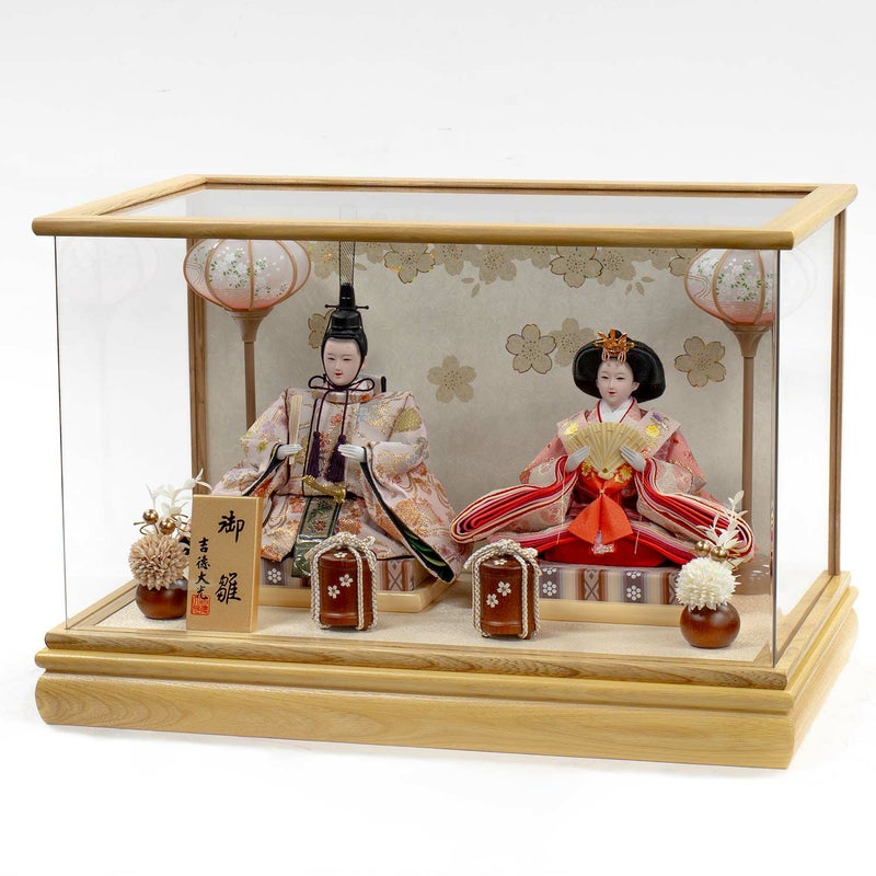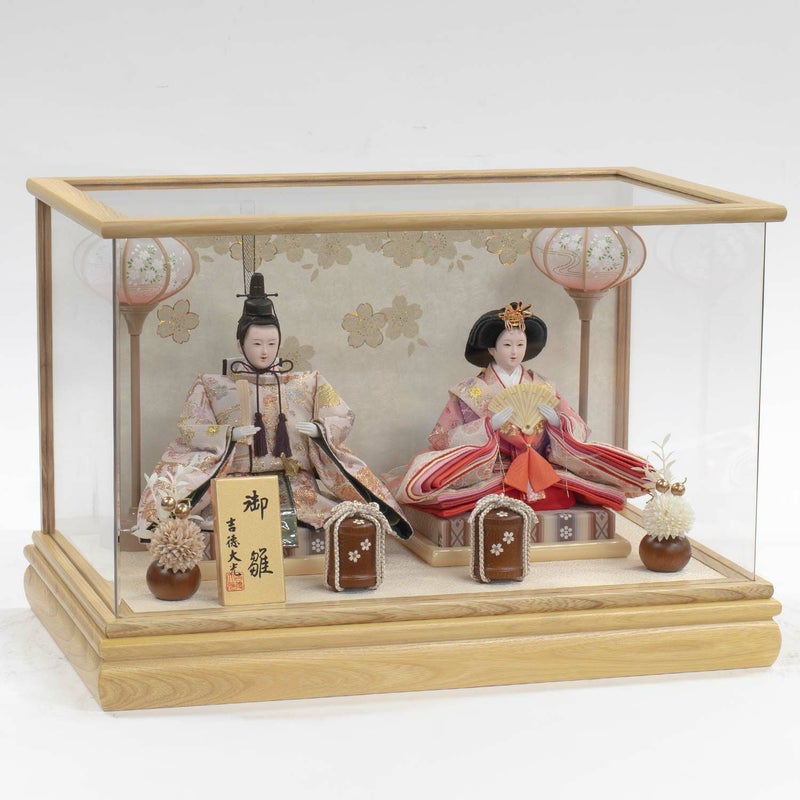 柔らかい色合いのケースに優しい色合い衣裳のお人形を組み合わせたケース飾り。