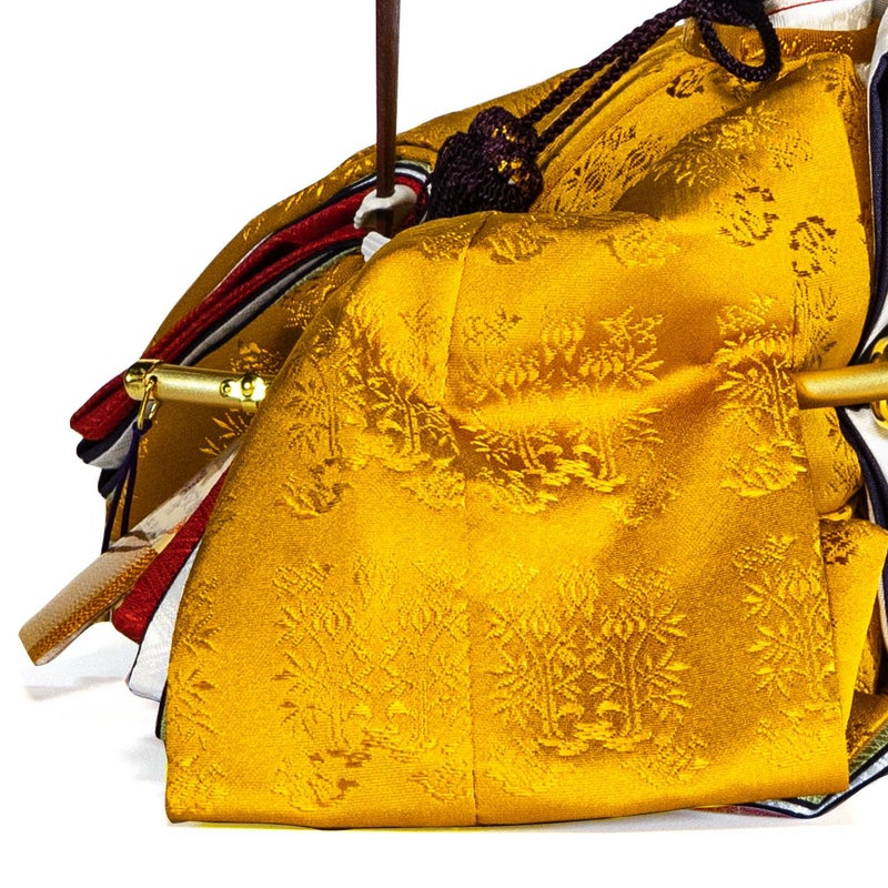 ■男雛には天皇陛下が晴れの儀式の際に着用する”黄櫨染桐竹鳳凰文(こうろぜんきりたけほうおうもん)”の正絹裂地を着せ付け。