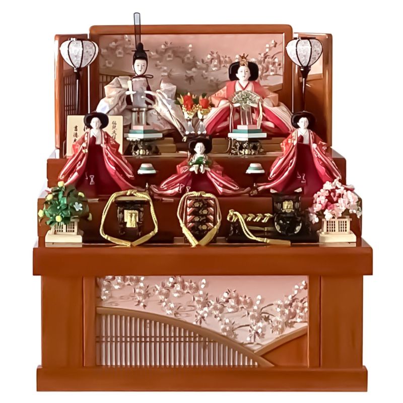 明るい木目調の収納箱に様々な花柄が描かれた衣裳を着せ付けたお人形がより一層映える引き出し式収納五人飾りです。人形の細部にもこだわり、女雛の裳には桜柄を様々な色合いの刺繍で仕上げました。道具には唐草文様を施しました。唐草は生命力が強く、また、途切れることなく伸びていくその様子から“子孫繁栄”“長寿”の意味があります。