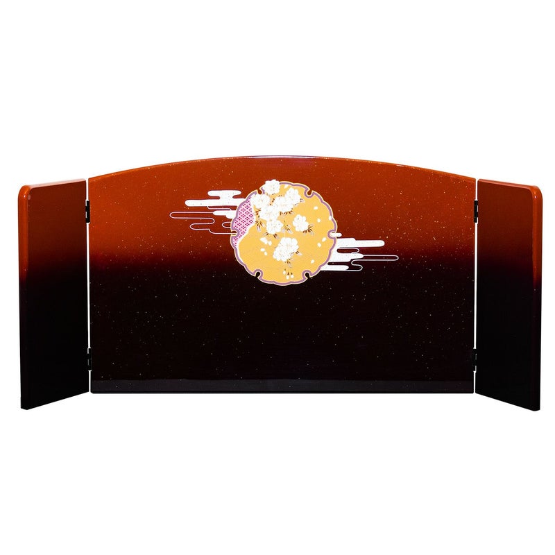 ■屏風・飾り台の幕板には茜色暈しに伝統文様の「雪輪」と「八重桜」を金彩で描きました。