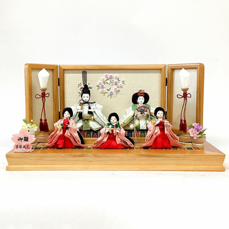 間口50cmの飾り台に親王、三人官女を一緒に飾れるコンパクト重視の五人飾りです。