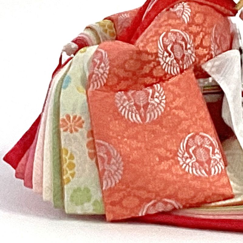 有職文様の一つ"向鶴"(むかいつる)が施さえたお人形をセットした五人飾りです。
