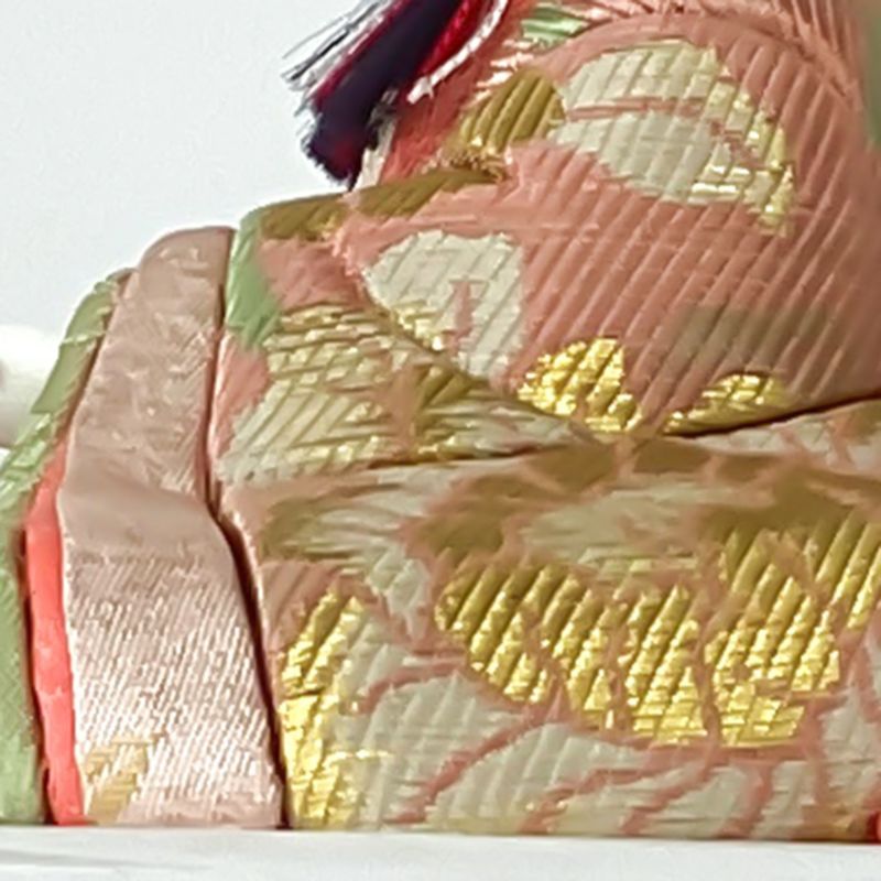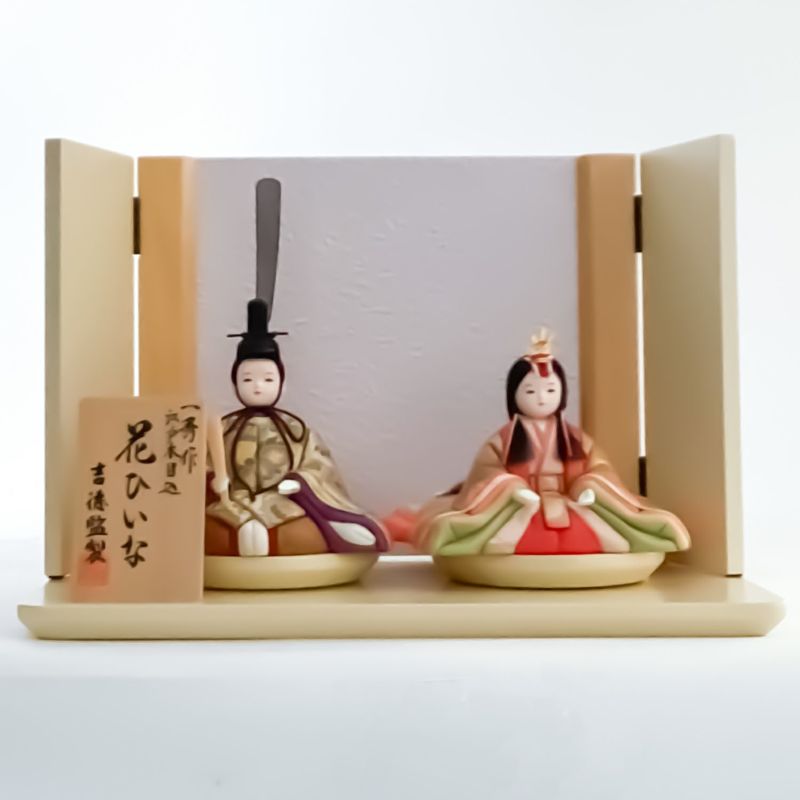 一秀作 木目込人形ピンク色の和紙で出来た屏風に淡い緑色の衣裳が映える落ち着いた雰囲気が印象的な木目込み親王飾りです。男雛女雛とも落ち着いた雰囲気ですが、それぞれに大きな花柄を衣裳に施したことで、華やかさも同時に感じます。