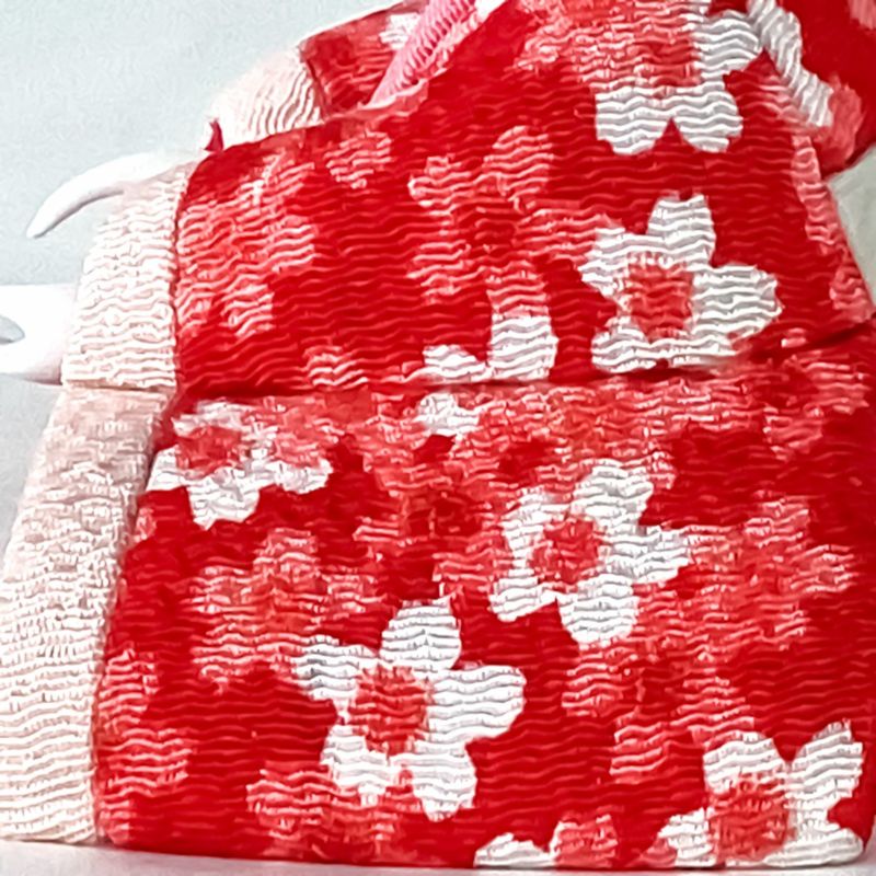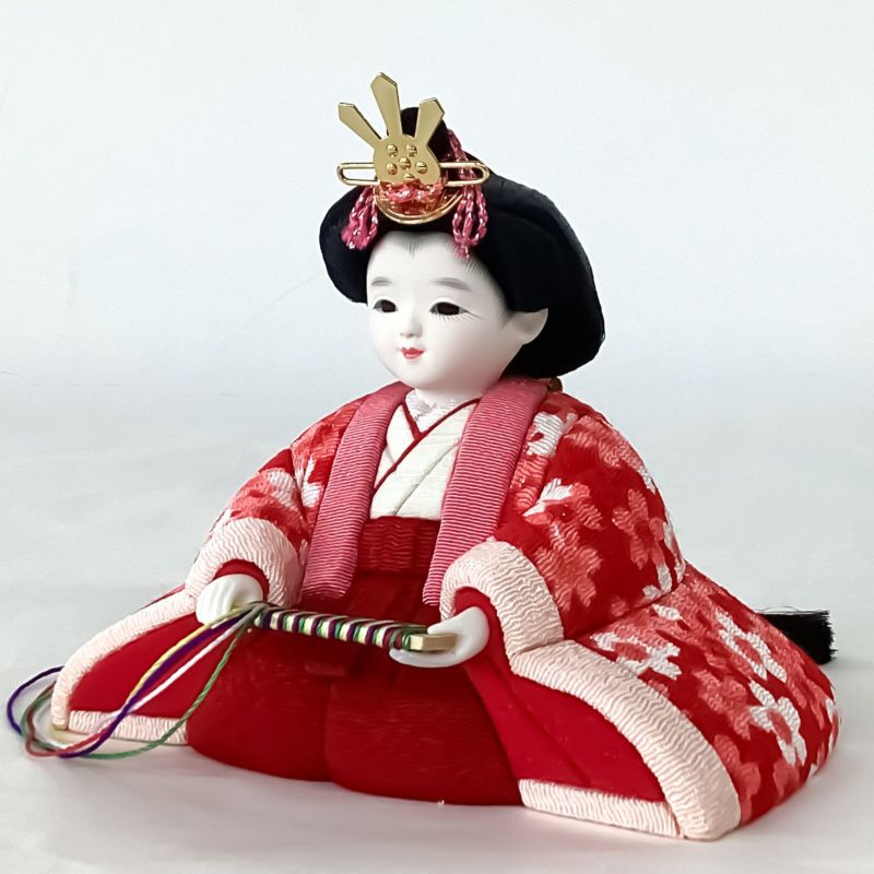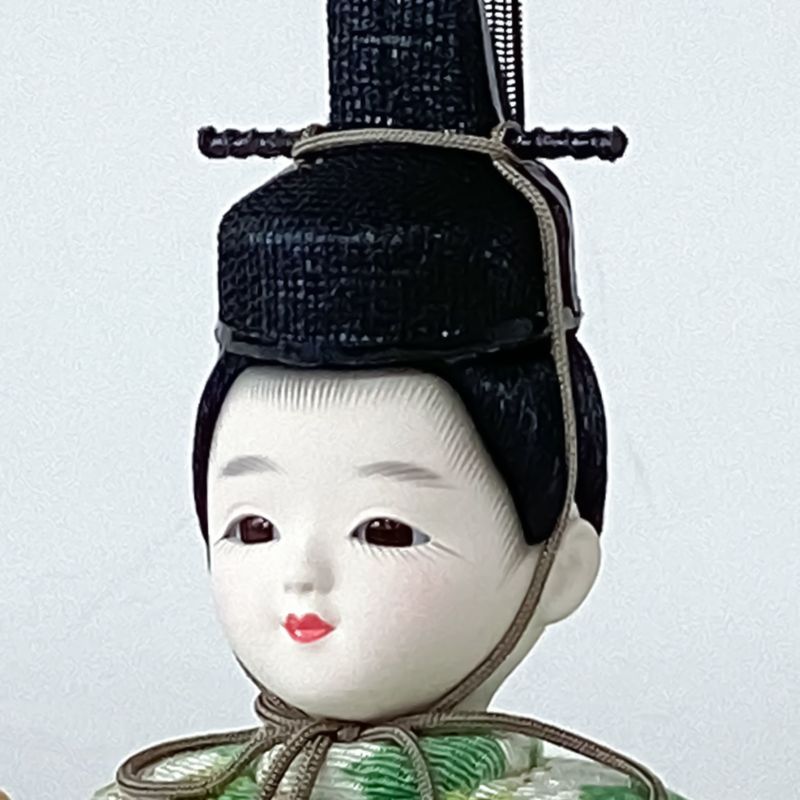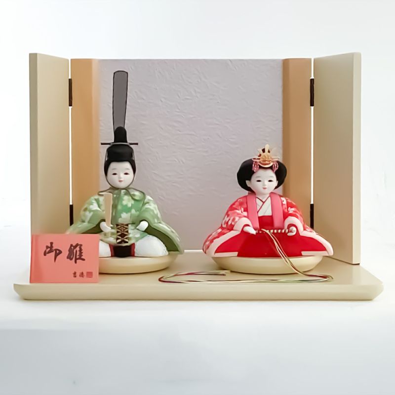 “若菜”と名付け可愛らしい花柄を男雛は緑色で、女雛は赤色の生地に織り込んだ衣裳が印象的なコンパクト雛人形です。目がパッチリと開いた丸顔の愛らしいお人形をセットしました。