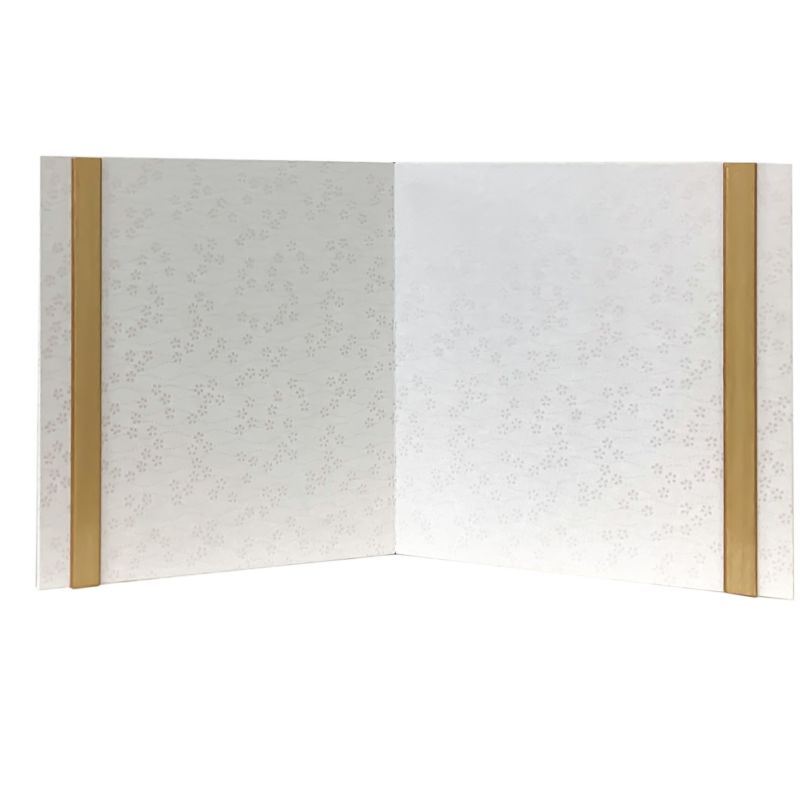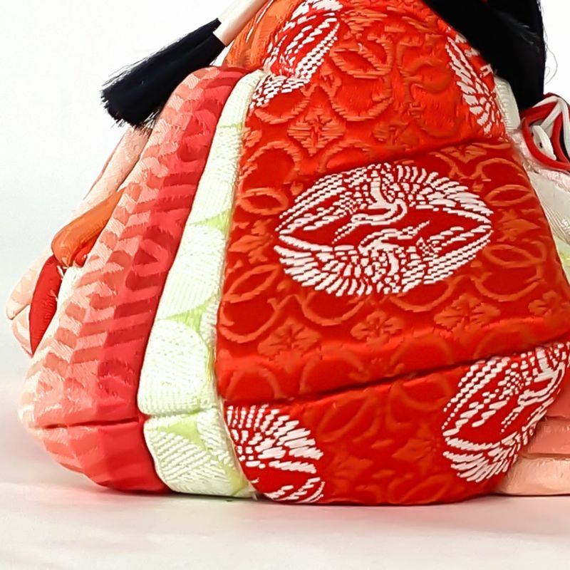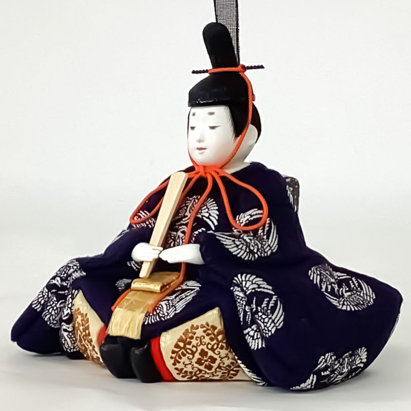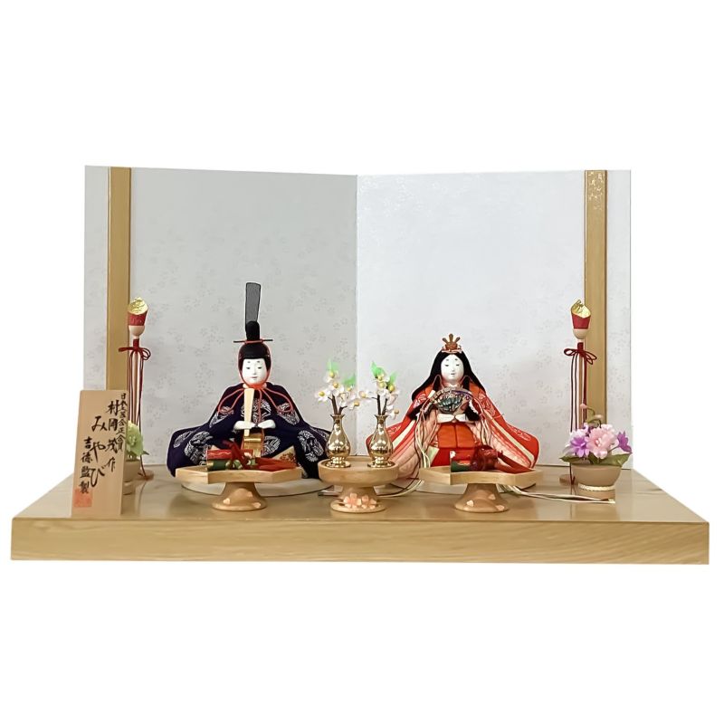 桧飾り台に小桜が描かれた屏風と和をイメージした木目込み親王飾りです。衣裳には有職文様の一つである”向い鶴”文様を織り込みました。“鶴は千年”と言われるように生命力と長寿の象徴とされる吉祥紋です。また、つがいと一生添い遂げることから、“夫婦円満”の象徴でもあります。