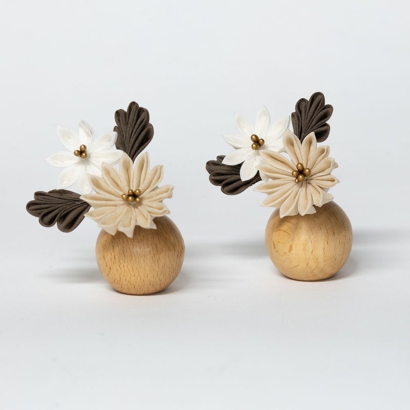 ■お人形の横にはモダンな色合いのつまみ細工の花を配しました。