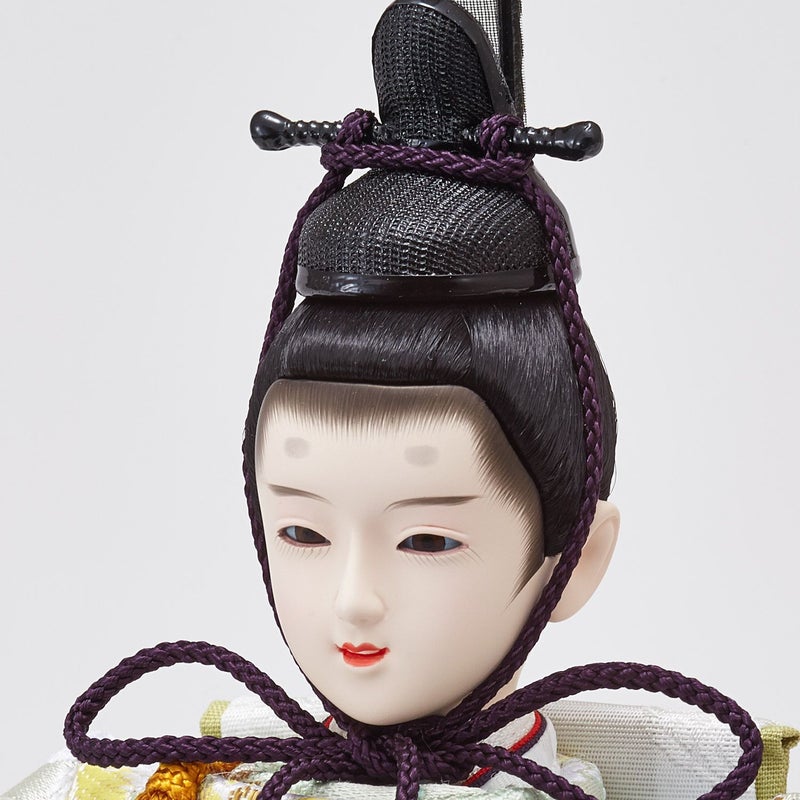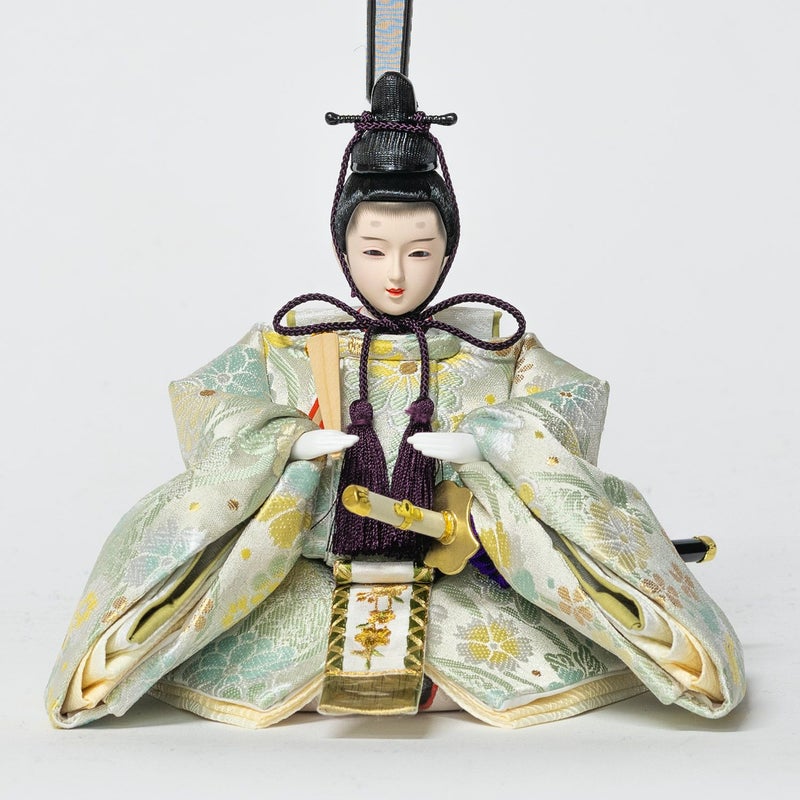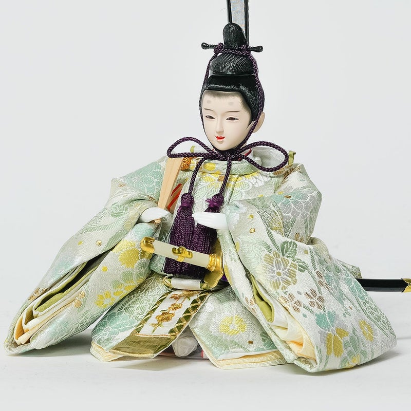 ■男雛には、淡い緑色に立涌菊花文様を織った衣裳を着せ付け。