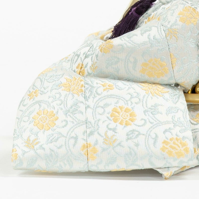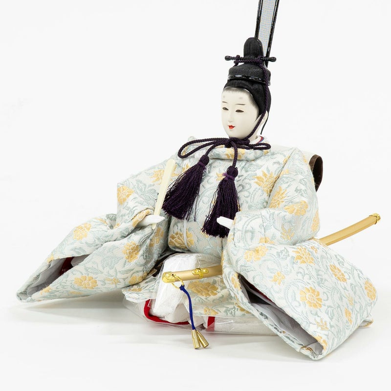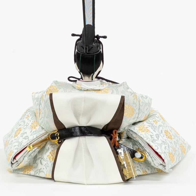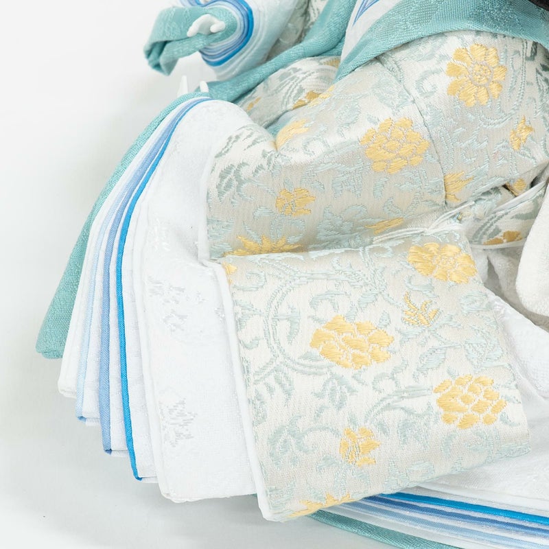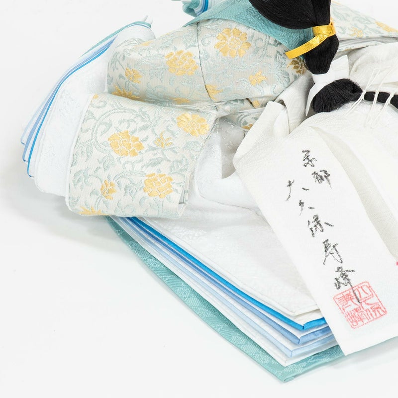 淡く美しい色合いの唐草模様を織り出し、「ブルー」の配色で特別に仕上げた正絹衣裳をお人形に着せ付けました。