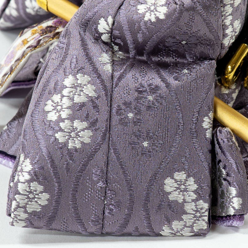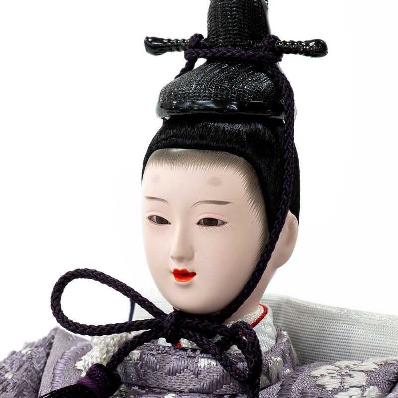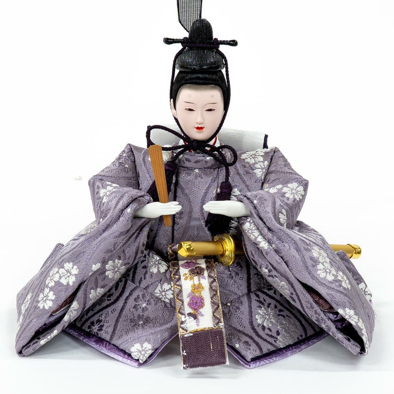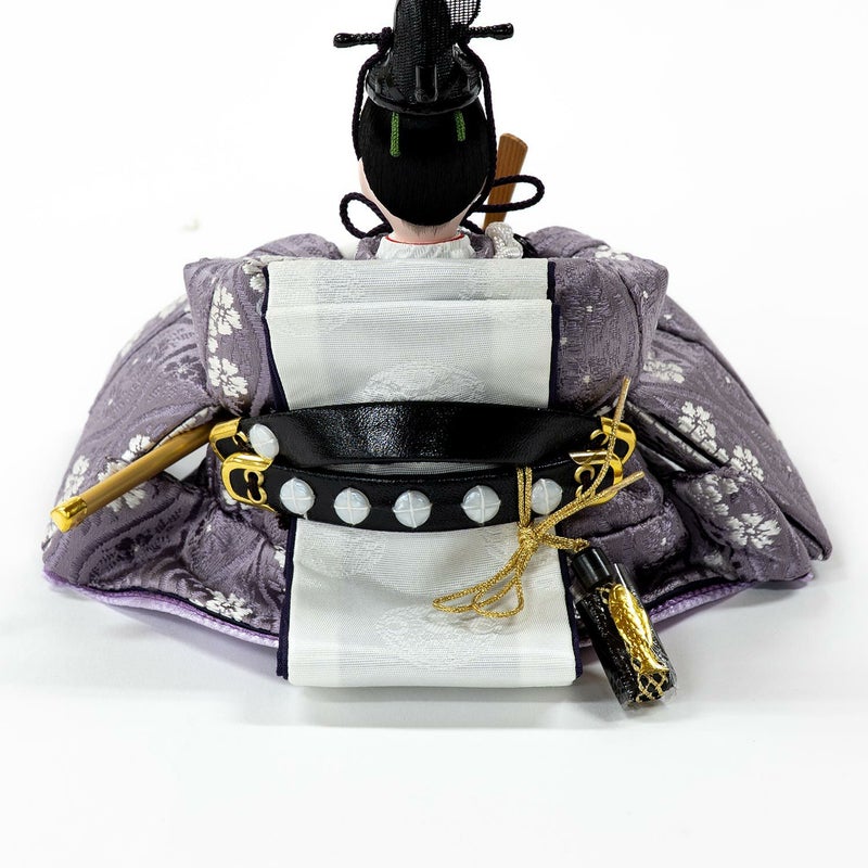 ■男雛は淡い紫色に雲立涌の地紋に桜柄を織り出した衣裳を着せ付け。