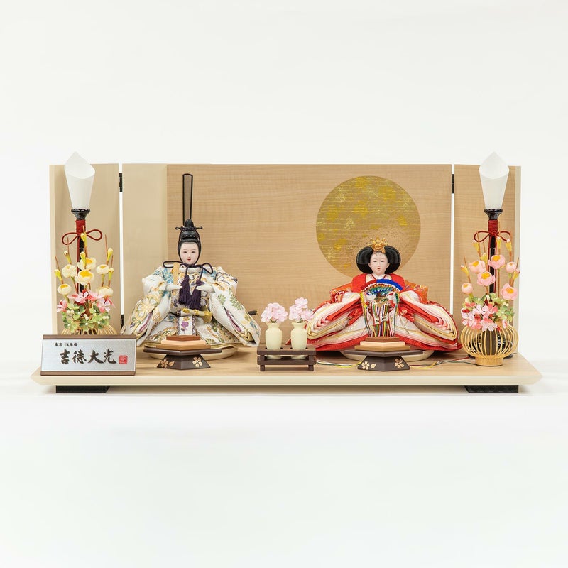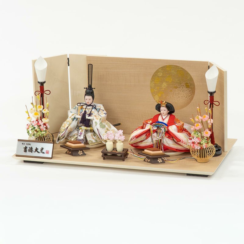 月を描いた屏風に華やかな衣裳を纏ったおひな様を組み合わせた親王飾りです。