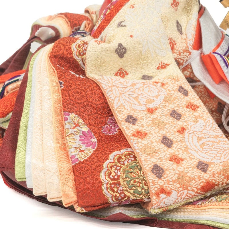 ■男雛の袖に若草色の〆切柄、女雛の袖には橙色の〆切柄がくるように正絹生地を柄どりし衣裳に仕立てました。