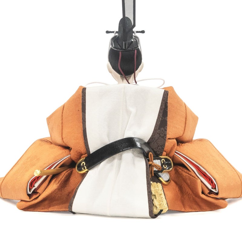 ■男雛は天皇陛下のみが着用される黄櫨染桐竹鳳凰文(こうろぜんきりたけほうおうもん)の正絹衣裳を着せ付け。