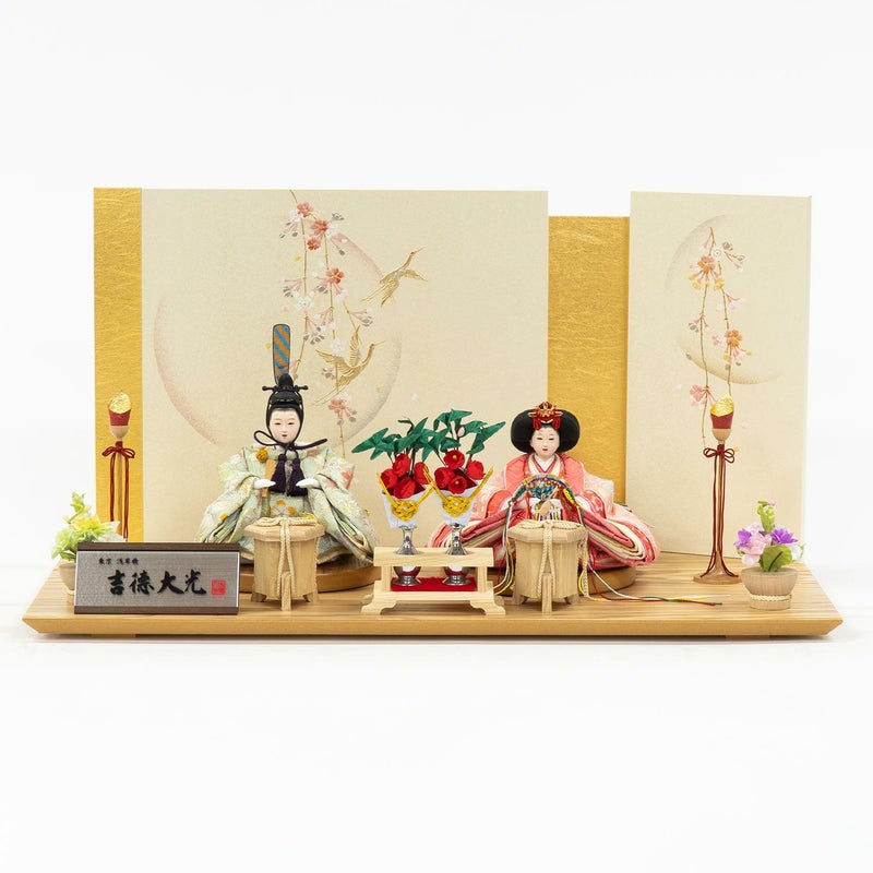 春らしい色合いの衣裳を纏ったお人形と桜と長寿の象徴「鶴」を描いた屏風を組み合わせました。