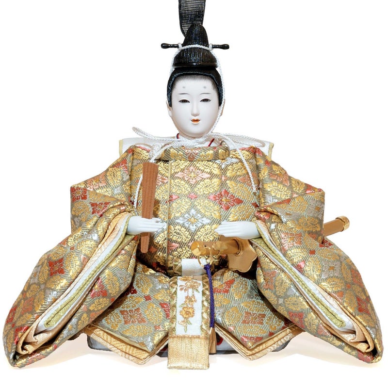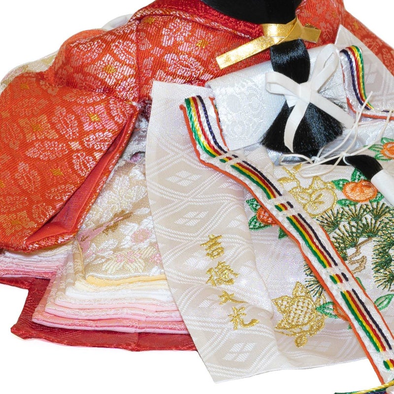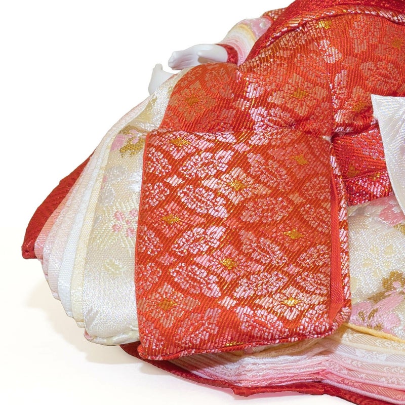 「江都みやびシリーズ」の男雛・女雛の衣裳は、正絹生地を用い、十二単を模した6枚剥ぎ。本物の衣裳のように丁寧に仕立ててから着せ付ける大変手間の掛かる本着せ付。