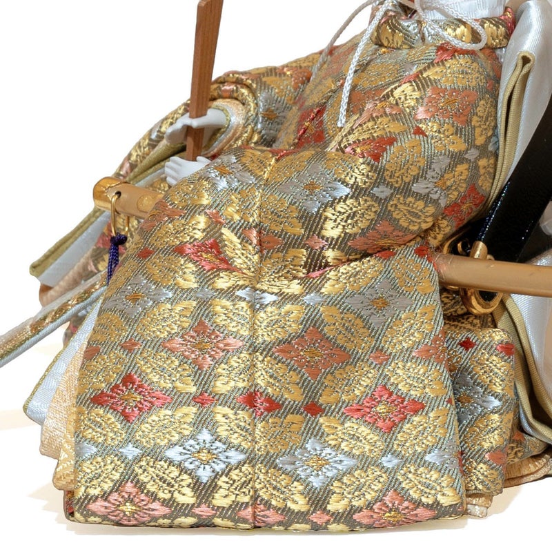 ■お人形には、小葵文の正絹金襴を本式に仕立て丁寧に着せ付け。