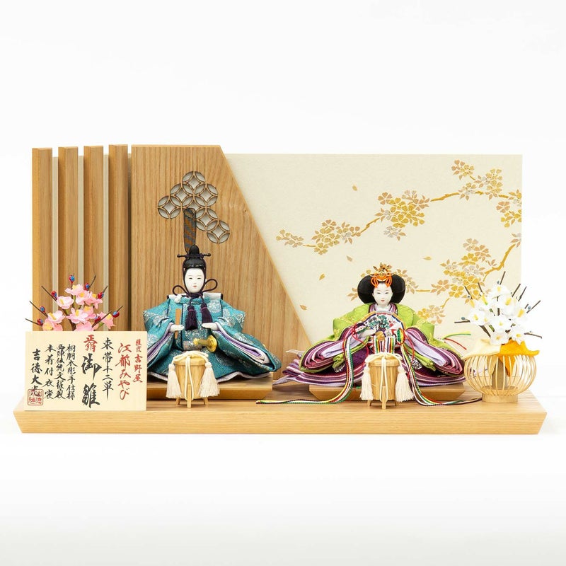 七宝文様や桜を描いた屏風にお人形が映える江都みやび親王飾りです。