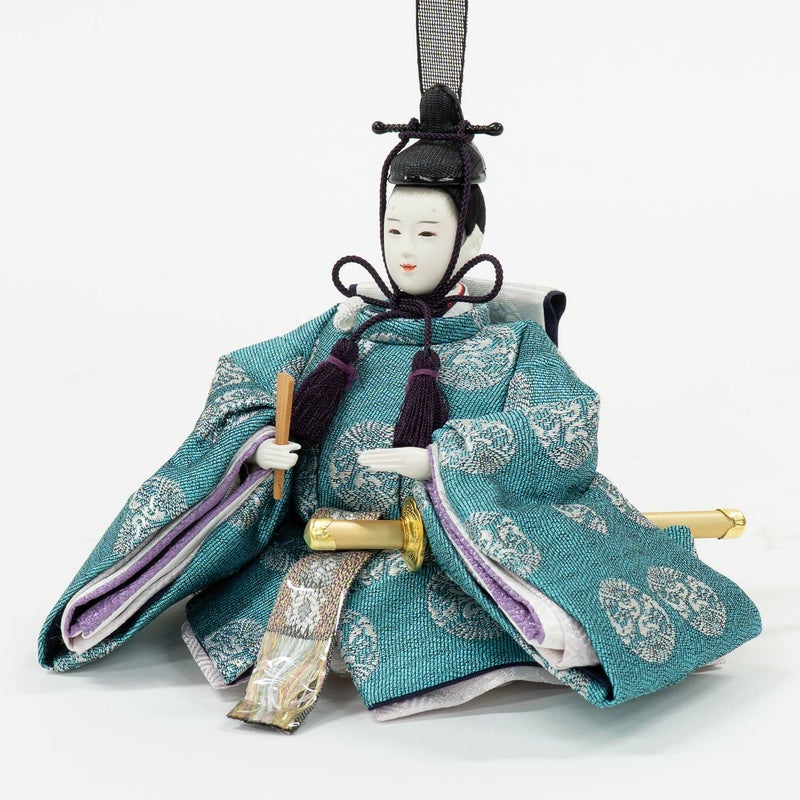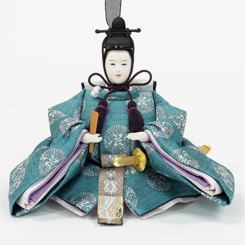 ■男雛には屏風に映えるブルーに雲鶴丸を織り出した正絹衣裳を着せ付け。