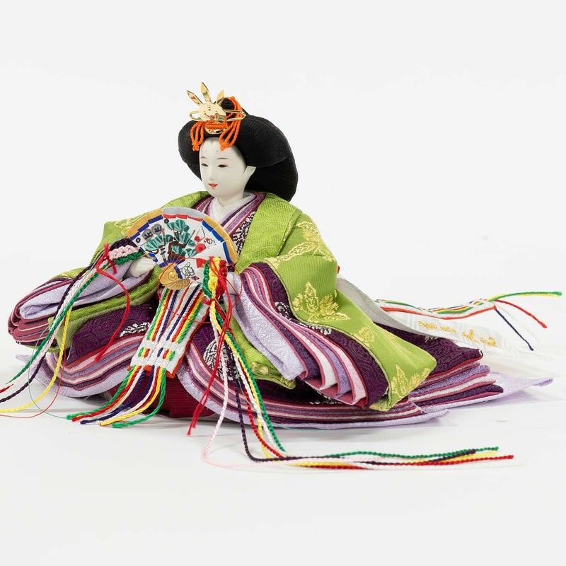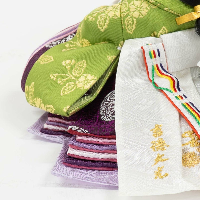 「江都みやびシリーズ」の男雛・女雛の衣裳は、正絹生地を用い、十二単を模した6枚剥ぎ。本物の衣裳のように丁寧に仕立ててから着せ付ける大変手間の掛かる本着せ付。