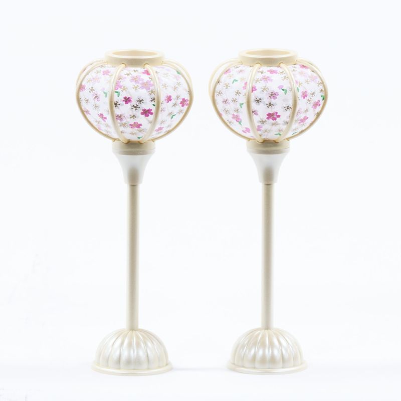 ■雪洞は、桜の花を描いたパールホワイトカラーのコードレスタイプ電池式で、明かりがともります。
