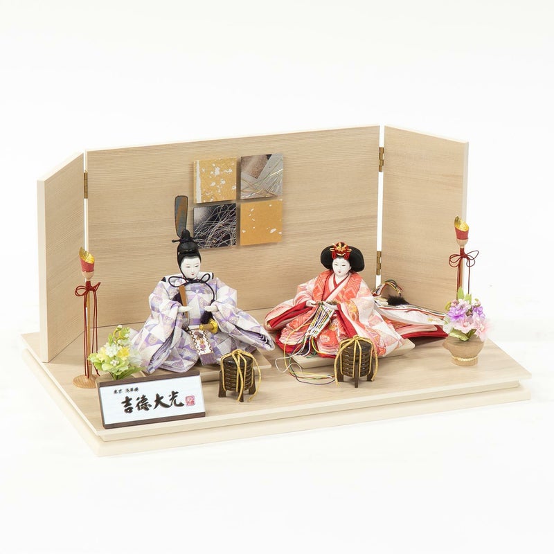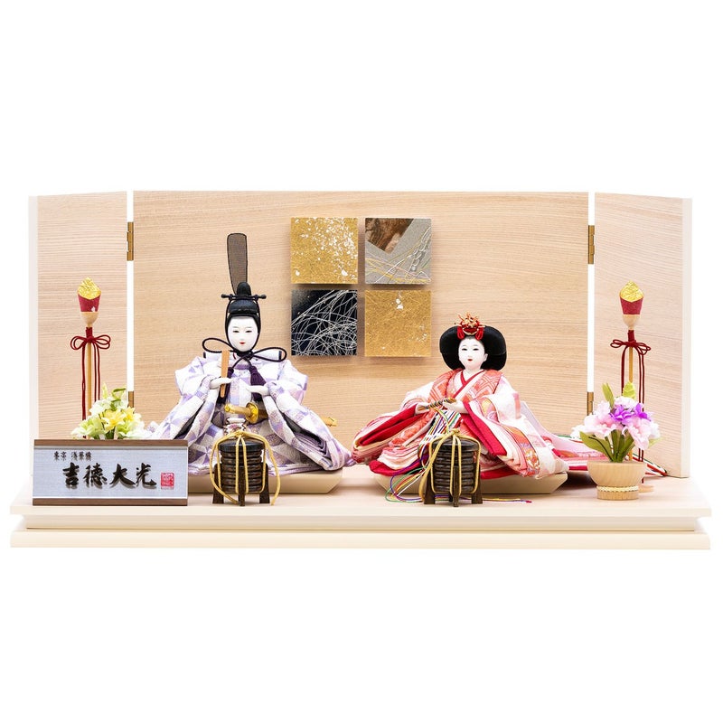 春らしい色合いの衣裳が木目の屏風に映えるおひな様。