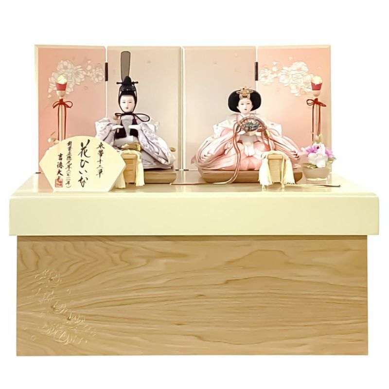 華やかで可愛らしいコンパクトサイズの収納箱飾りです。ピンクのグラデーションがかかった屏風に八重桜を金彩で描きました。幾重にも重なる八重桜の花びらはふんわりと丸く「豊かさ」と「しとやかさ」を表しています。木目収納箱の幕板にもさりげなく金彩で八重桜を描いています。お人形には、淡い色合いの向鶴菱に唐花文様が織り出された金襴衣裳を使用し着せ付けました。