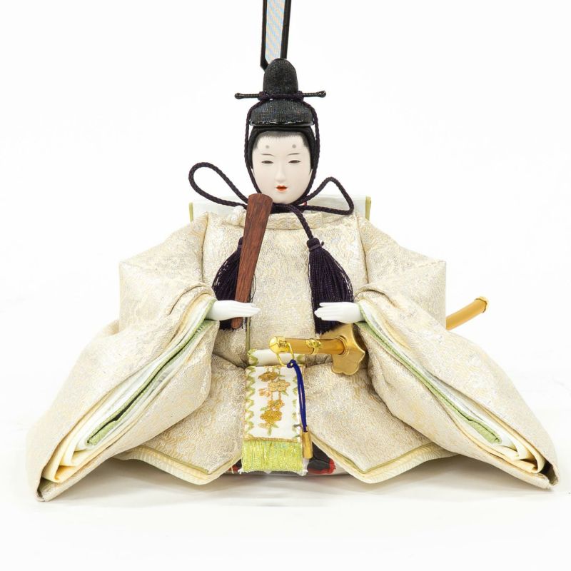 「江都みやびシリーズ」の男雛・女雛の衣裳は、正絹生地を用い、十二単を模した6枚剥ぎ。本物の衣裳のように丁寧に仕立ててから着せ付ける大変手間の掛かる本着せ付。