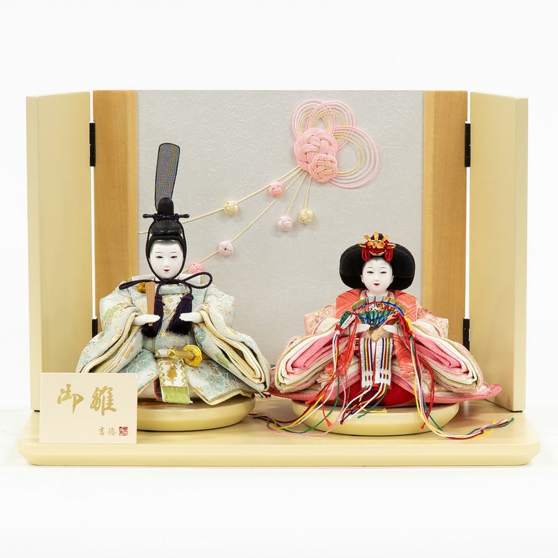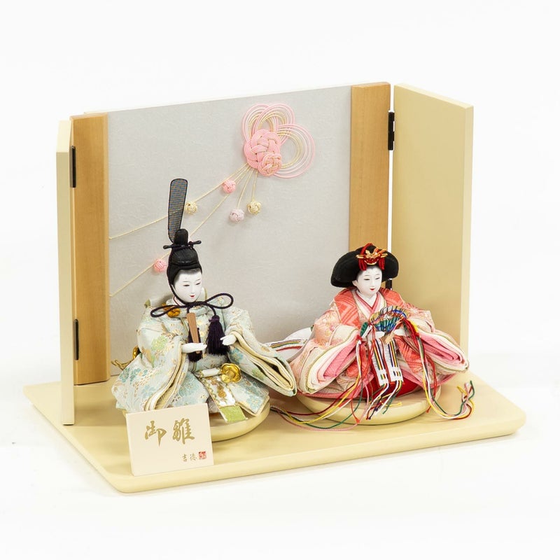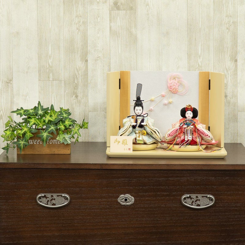 屏風に施した「水引」が印象的なコンパクトタイプの親王飾り。