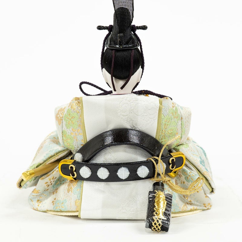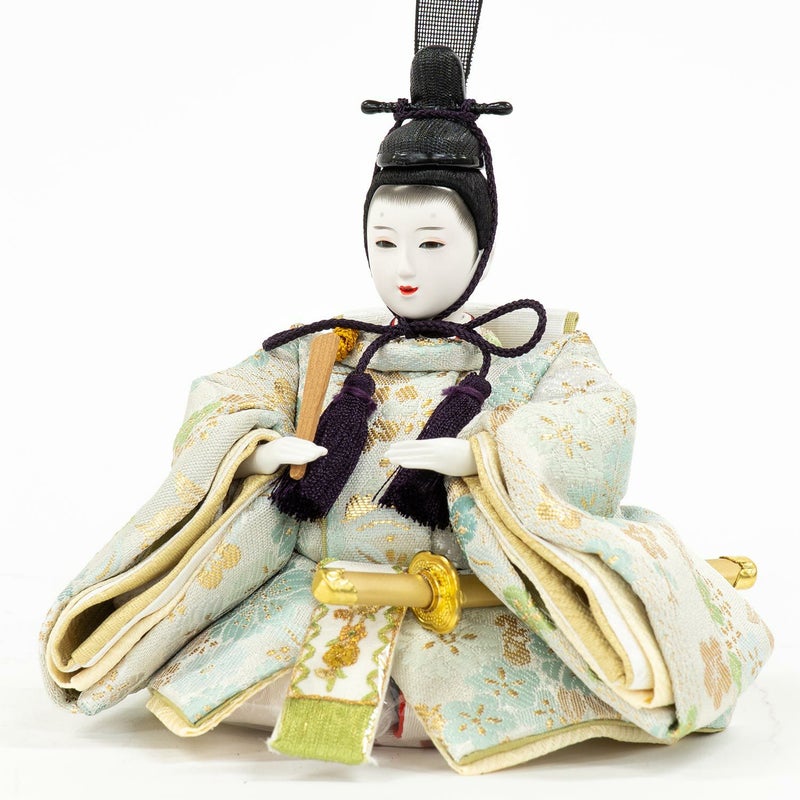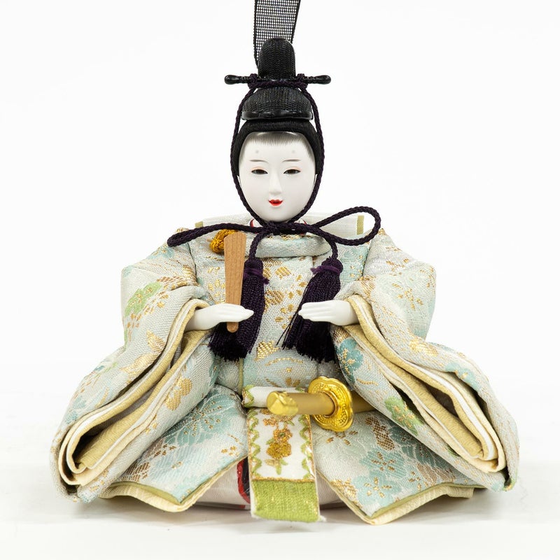 ■芽吹いた若葉のような色合いの衣裳が印象的な女雛。