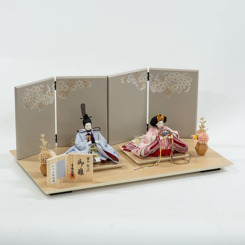 春を代表する「桜」をシックな色合いにまとめた、柴田家千代作のモダンな親王飾りです。