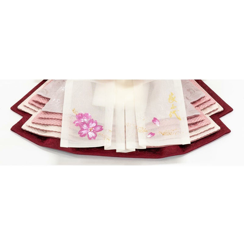 ■女雛の裳には、作者の名前「家千代」の名、アクセントに可愛らしい桜を描きました。