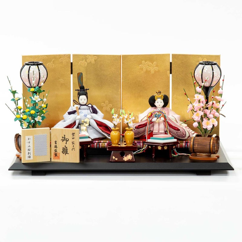 春を代表する「桜」を衣裳に刺繍した、柴田家千代作のモダンな親王飾りです。